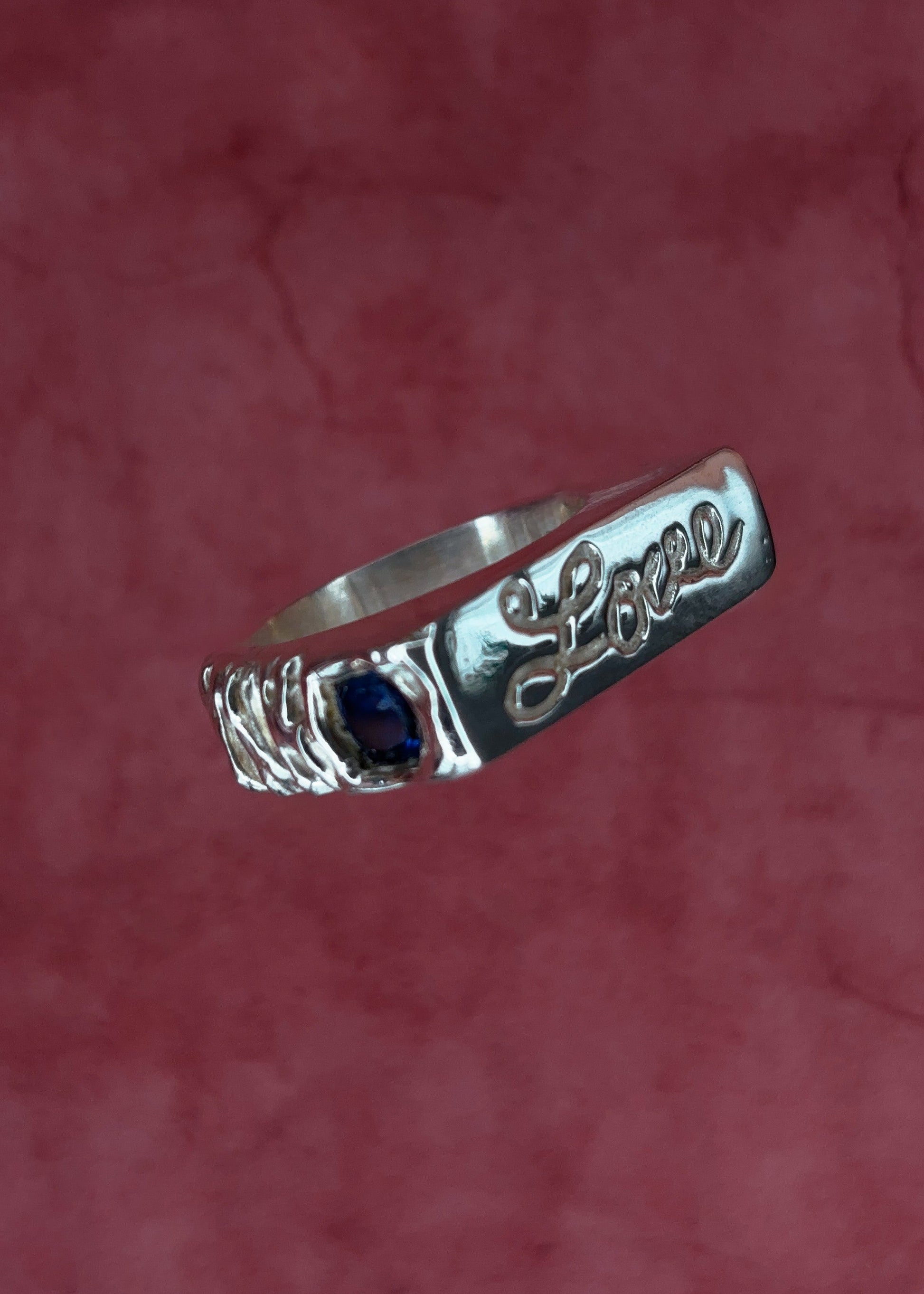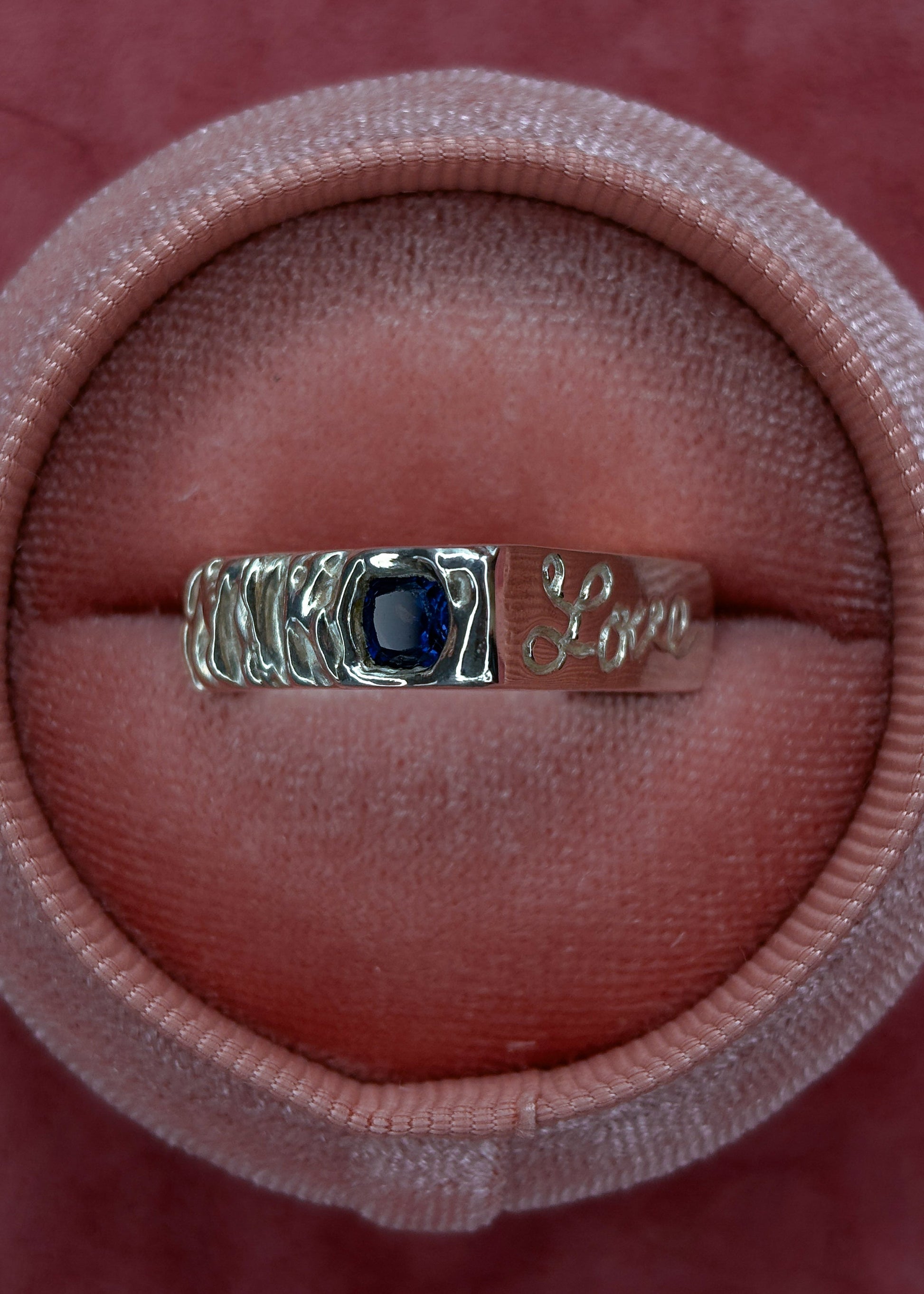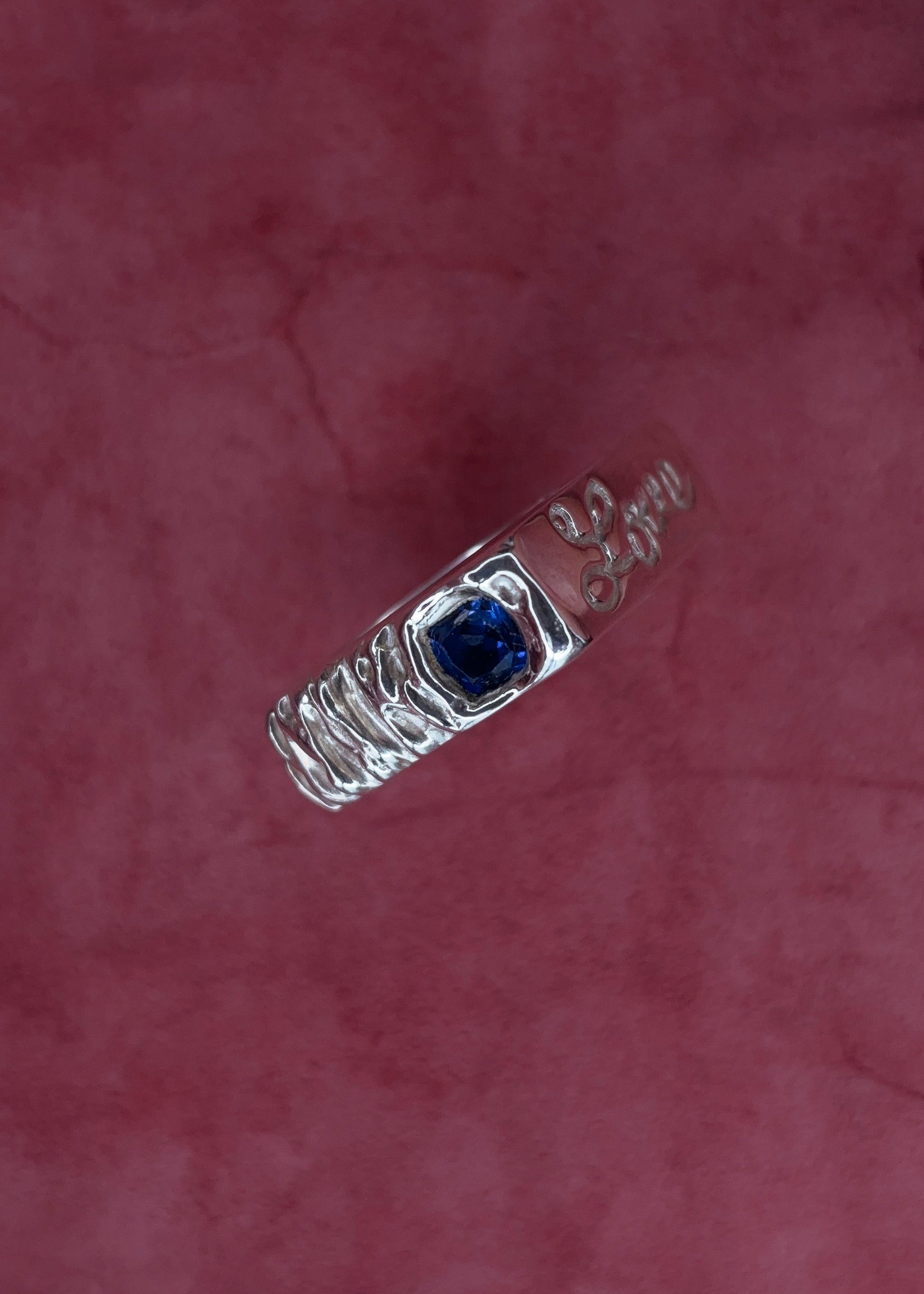 - Features a lab-created blue sapphire